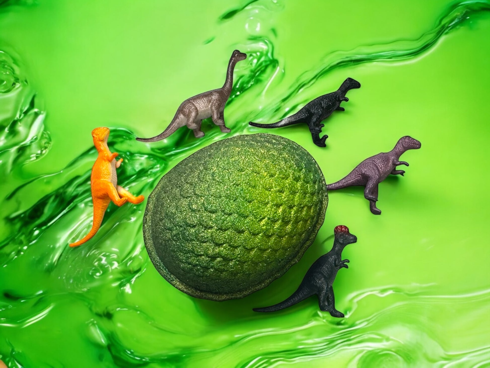Get ready for a ROAR-some bath time adventure! 🛁 Our handmade Dinosaur Egg Bath Bombs are packed with fizz, fun, and a hidden Dinosaur toy inside! Drop one in the tub and watch it hatch into a swirling, prehistoric masterpiece.